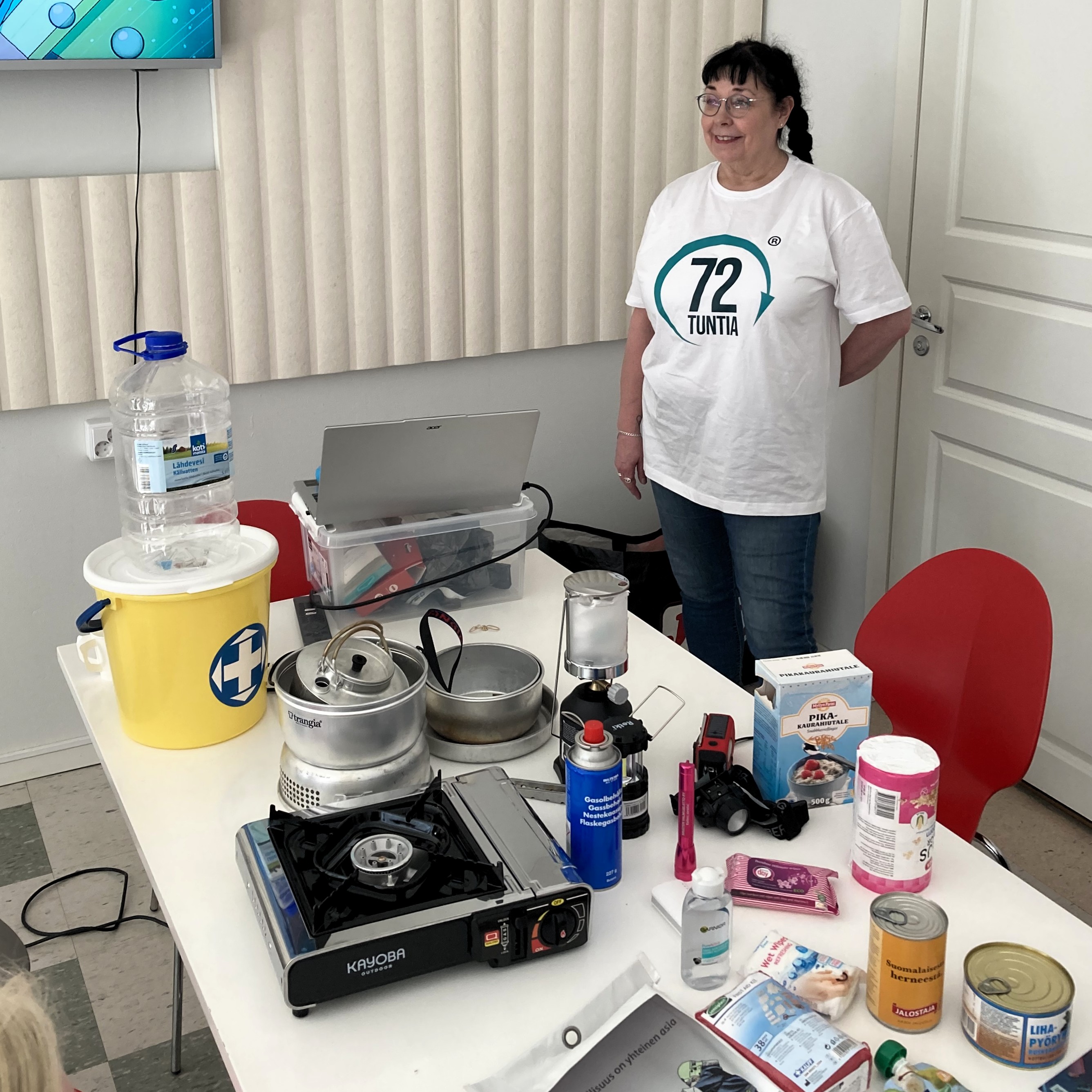 Varautumiskouluttaja Hanna Heikkilä vieraili HTY:n Seniorikahvilassa 13.4.2026. Hän kertoi 72 tunnin varautumissuosituksesta.