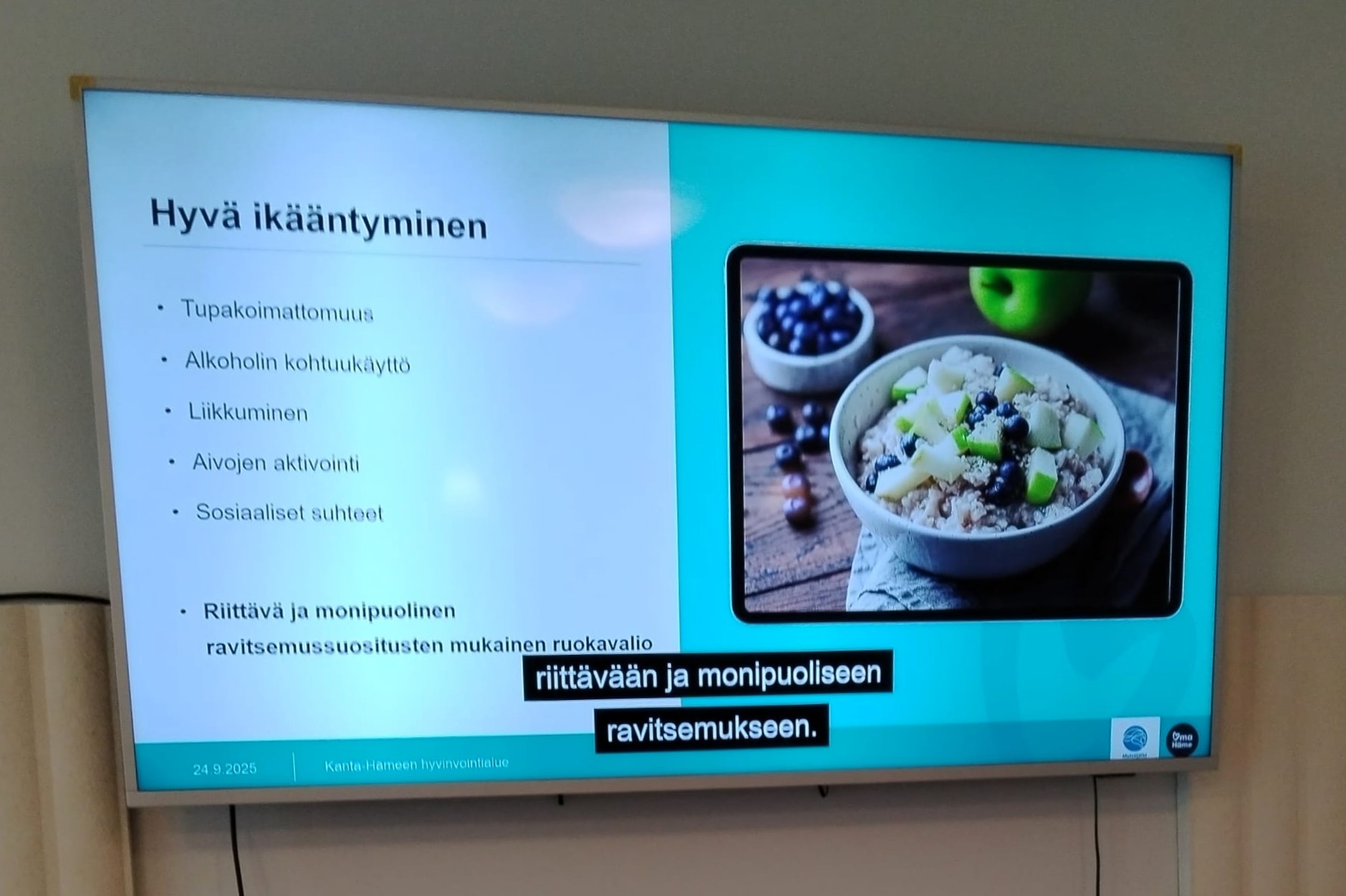 Seniorikahvilassa 26.1.2026 keskustelun alustaja oli sairastunut, joten ravitsemuksen rooliin ikääntyessä perehdyttiin Oma Hämeen videon avulla. Videolla painotettiin, että ravitsemus tukee aivoterveyttä. Ruokavalio vaikuttaa verisuoniterveyteen ja sitä kautta muisti- ja ajattelutoimintoihin. Kasvisten, hedelmien ja marjojen, kalan sekä kasviöljyjen runsaampi käyttö suojaa muistitoimintoja. Myös ravintokuitu ja mm. täysjyvävalmisteista, kasviksista ja kasviöljypohjaisista tuotteista saatavat vitamiinit saattavat suojata muistisairauden kehittymiseltä.