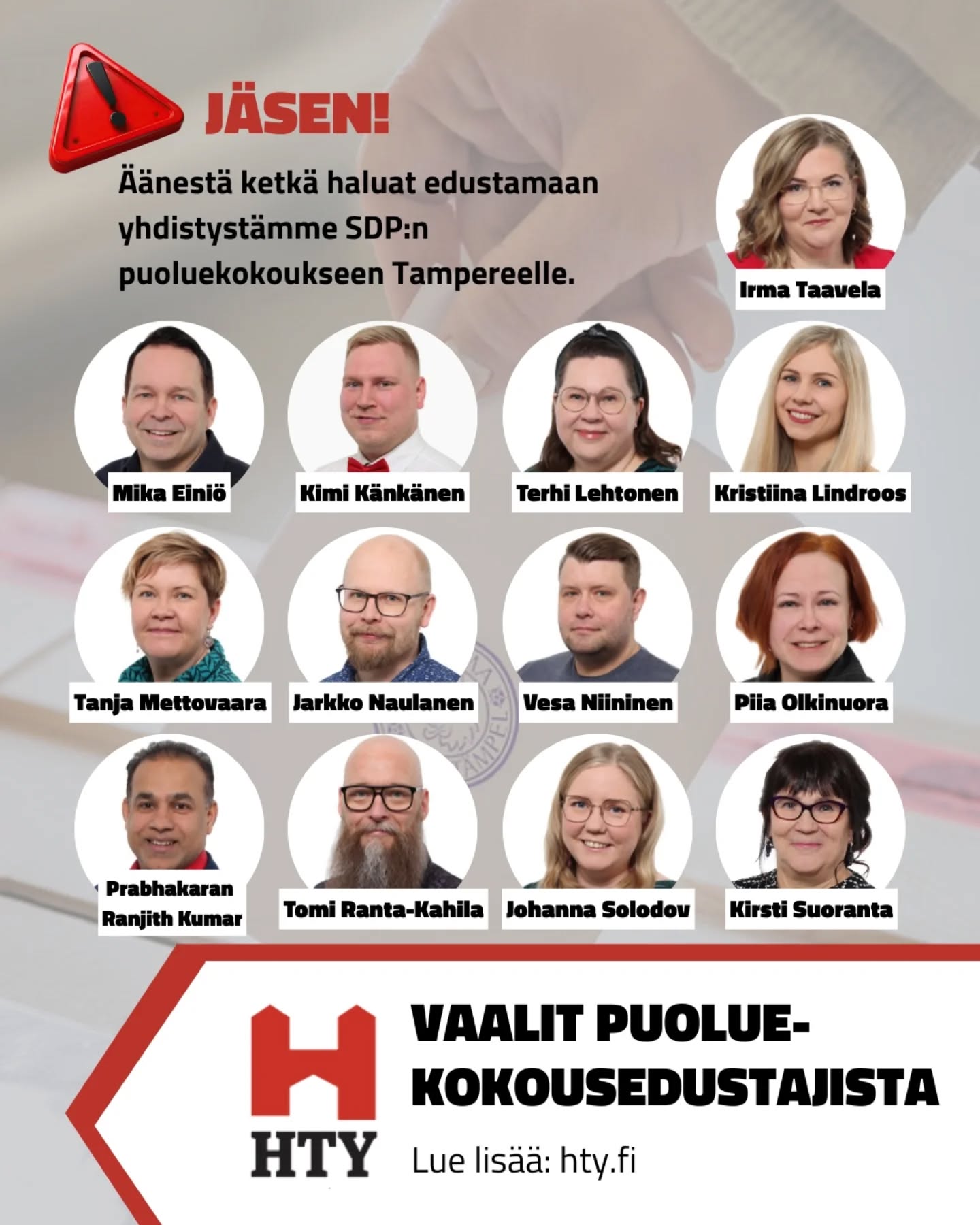 Jäsenäänestys HTY:n puoluekokousedustajaehdokkaista järjestetään uurnavaalina sunnuntaina 15.2.2026 kello 10.00-17.00 HTY:n toimitilassa (Raatihuoneenkatu 20, Hämeenlinna). Ehdolla ovat Mika Einiö, Kimi Känkänen, Terhi Lehtonen, Kristiina Lindroos, Tanja Mettovaara, Jarkko Naulanen, Vesa Niininen, Piia Olkinuora, Prabhakaran Ranjith Kumar, Tomi Ranta-Kahila, Johanna Solodov, Kirsti Suoranta ja Irma Taavela.