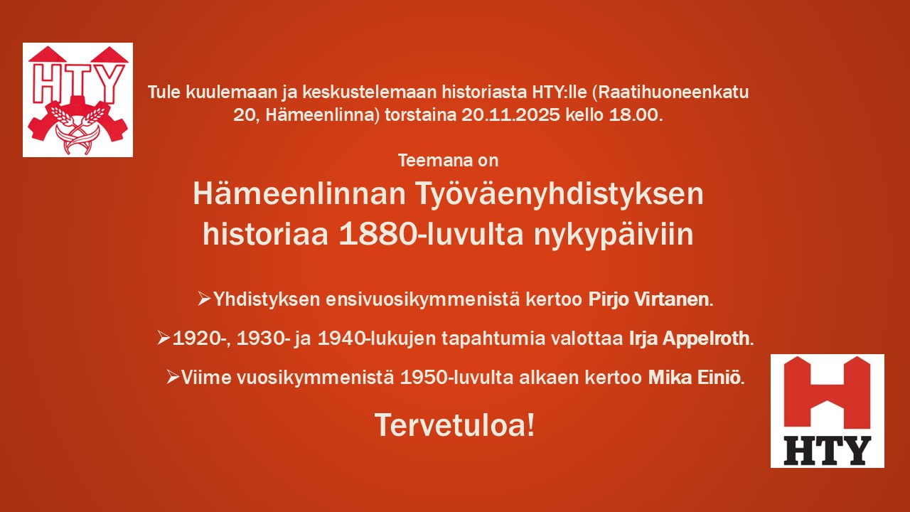 « All Tapahtumat Tämä tapahtuma on mennyt. HTY:n historiaa marraskuu 20 @ 18:00 - 20:00 Tapahtuma navigointi « Johtokunnan kokous Seniorikahvilassa pelataan bingoa » Osana HTY:n järjestämää historian luentosarjaa kuullaan oman yhdistyksemme, Hämeenlinnan Työväenyhdistyksen historiasta. + Google-kalenteri+ iCal-vienti Tarkemmat tiedot Päivämäärä: marraskuu 20 Aika: 18:00 - 20:00 Tapahtumaluokat: Luento, Teematapahtuma Tapahtuma tagia:HTY:n historiaa Tapahtumapaikka HTY:n toimitila, Raatihuoneenkatu 20, Hämeenlinna Raatihuoneenkatu 20 Hämeenlinna, + Google Map