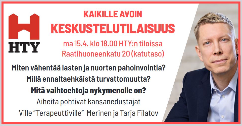 Tervetuloa kuuntelemaan Ville Merisen ja Tarja Filatovin pohdintoja ja tervetuloa keskustelemaan muun muassa lasten ja nuorten pahoinvoinnin vähentämisestä.