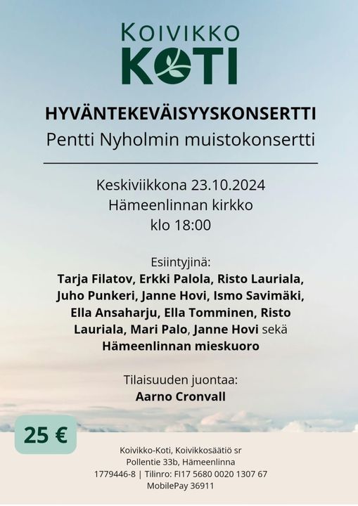 Syksy tuo mukanaan Koivikko-kodin hyväntekeväisyyskonsertin. Konsertti pidetään keskiviikkona 23.10.2024 kello 18:00 Hämeenlinnan kirkossa. Konsertti on myös muistokonsertti Pentti Nyholmille, joka niin kauan piti monin tavoin huolta Koivikko-kodista. Ohjelmat ovat myynnissä Suomalaisessa kirjakaupassa, Kauppakeskus Goodmanissa. Ohjelman hinta on 25 euroa kappale. Ohjelmia myydään myös tunti ennen konsertin alkua kirkon ovella.