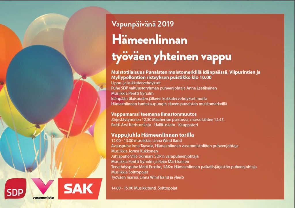 Työväen yhteistä vappujuhlaa vietetään Hämeenlinnan kauppatorilla: