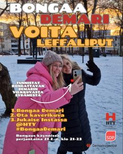 Bongaa Demari ja voita leffaliput itsellesi ja kaverille! Jaossa 3 x 2 kpl elokuvalippuja. Voit osallistua bongaamalla Demarin tai demariopiskelijan Hämeenlinnassa HPK-approjen jälkeen jäähallin ja keskustan välillä perjantaina 21.2.2025 noin klo 21-23. 1. Bongaa Demari, jolla on vilkkuva sydän 2. Ota kaverikuva Demarin kanssa 3. Julkaise kuva Instagramissa käyttäen aihetunnistetta #BongaaDemari ja tägää @hameenlinnan_tyovaenyhdistys (HTY) Kaikki osallistujat saavat heti lakupatukan ja Demariopiskelijoilla on jaossa haalarimerkkejä! Leffalippujen voittajat arvotaan julkaistujen kuvien kesken lauantaina ja voittajille ilmoitetaan henkilökohtaisesti DM