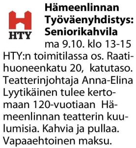 Seniorikahvilan vieraaksi saapuu teatterinjohtajan Anna-Elina Lyytikäinen Hämeenlinnan Teatterista.