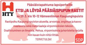 Hämeenlinnan Kaupunginpuistossa ”Pääsiäispupun polku” -tapahtuma koko perheelle. Valmistaudumme palmusunnuntaihin valmistamalla virpomisvitsoja ja tutkailemme, mitä mukavaa tekemistä pääsiäispupu on tänä vuonna keksinyt. Tarjolla mehua ja pipareita, tarvikkeita virpomisvitsoihin, kasvomaalausta ja ongintaa.