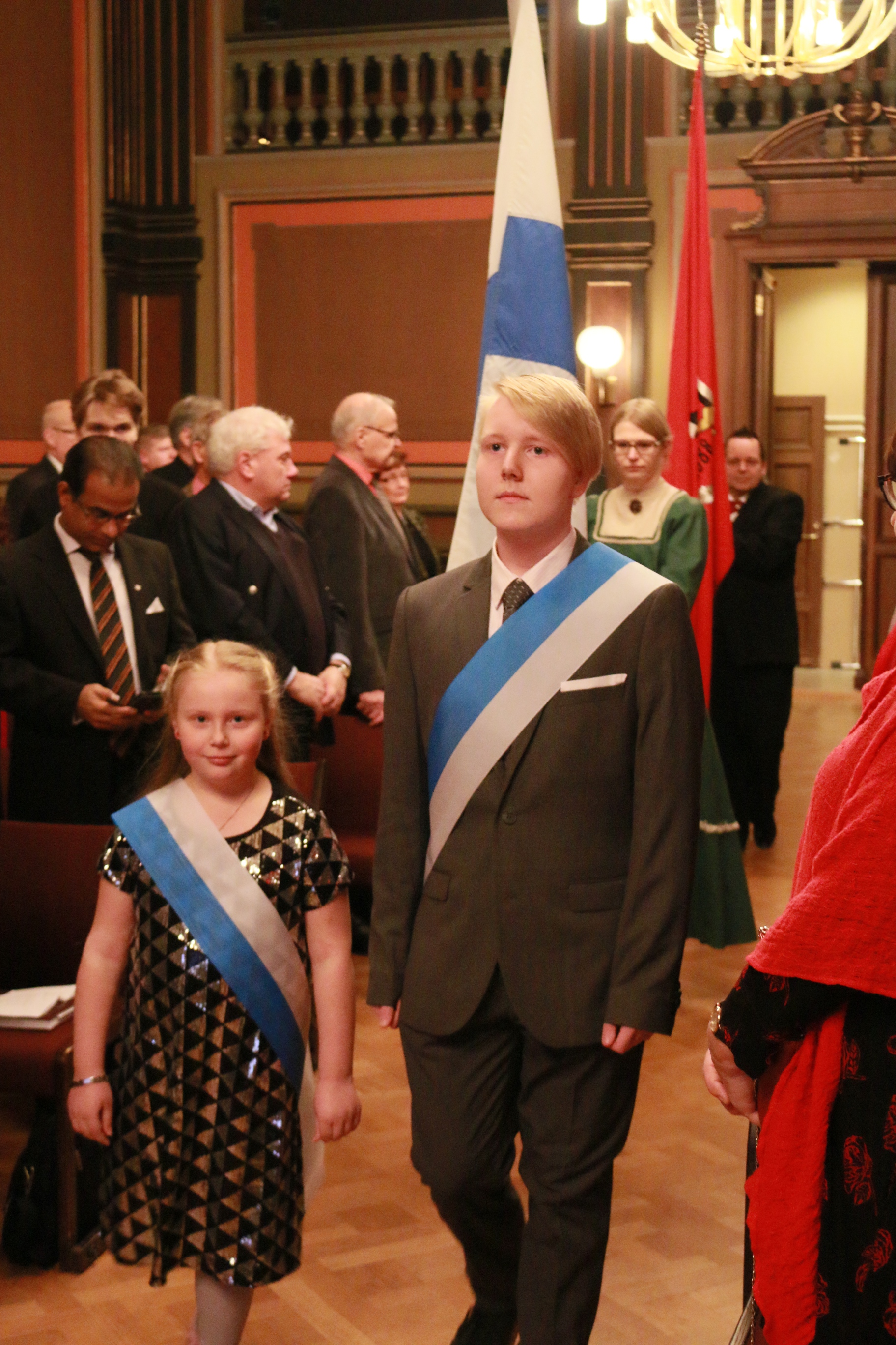 Pääjuhlassa Leppäkosken Puhallinorkesterin tahdittamana Suomen lipun kantoi juhlasaliin Ulla Appelroth ja HTY:n lipun toi Mika Einiö. Airueina toimivat Emmi ja Max Heinonen.
