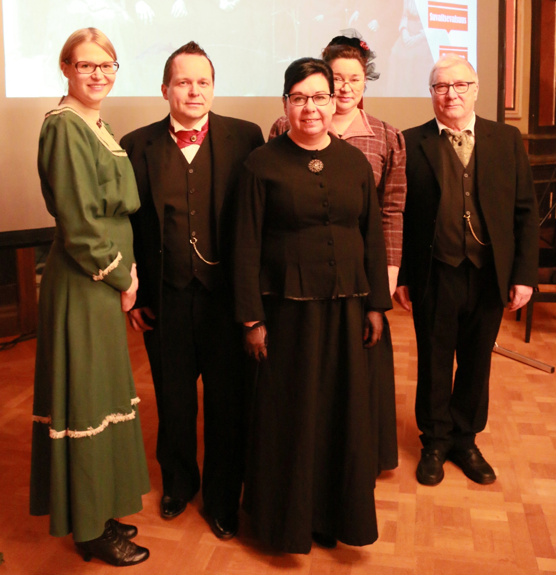 HTY:n historian merkkihenkilöitä yhteiskuvassa: Hilda Eklöf (Ulla Appelroth), G. W. Liukkonen (Mika Einiö), Lyydia Louhi (Kirsi Hultin), Milda Jokinen (Kirsi-Kaisa Sinisalo) ja Vihtori Huhta (Aarne Kauranen).