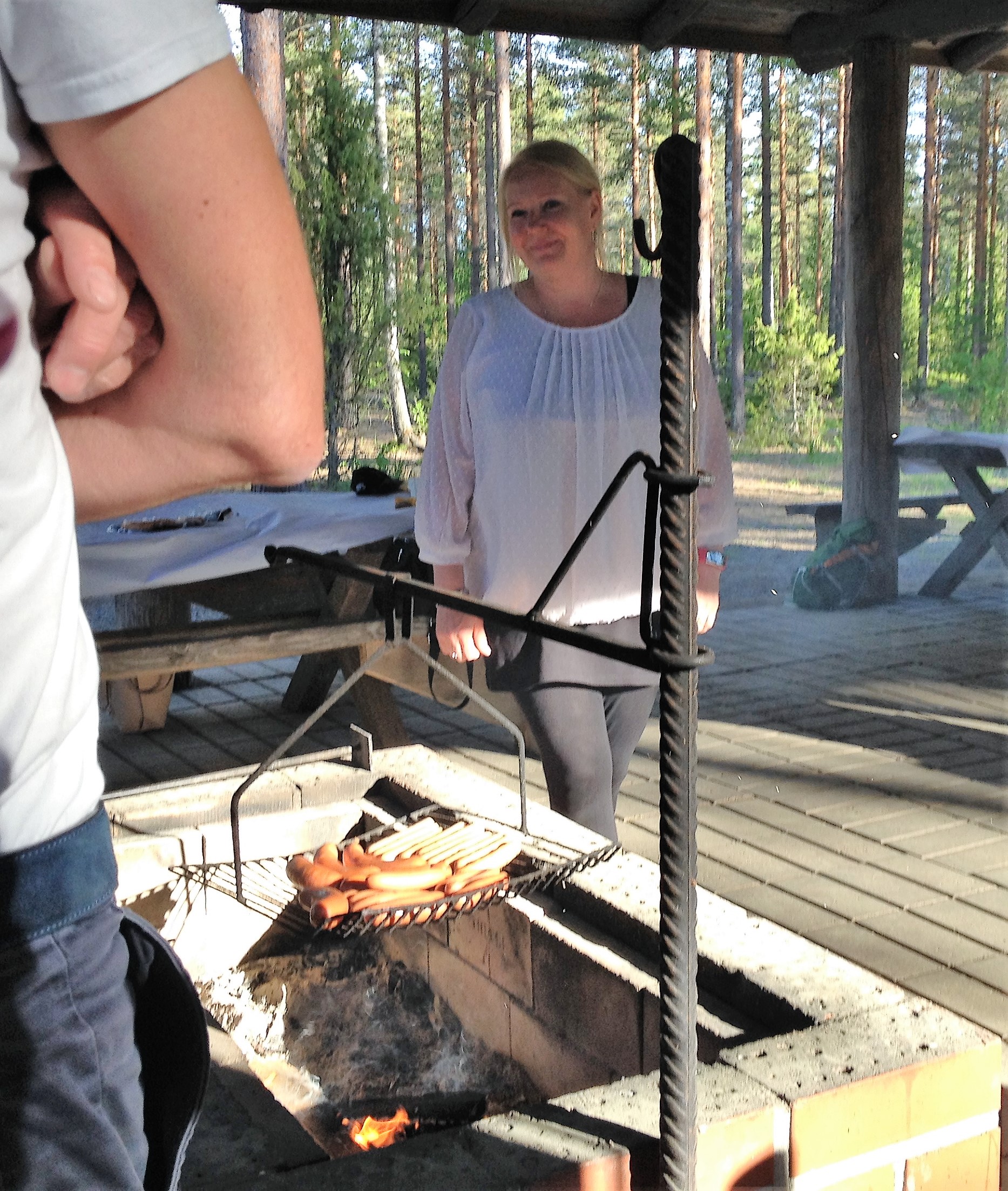 Makkarat paistuvat Jussin nuotiokatoksella Evolla. Kuva Pirjo Virtanen.