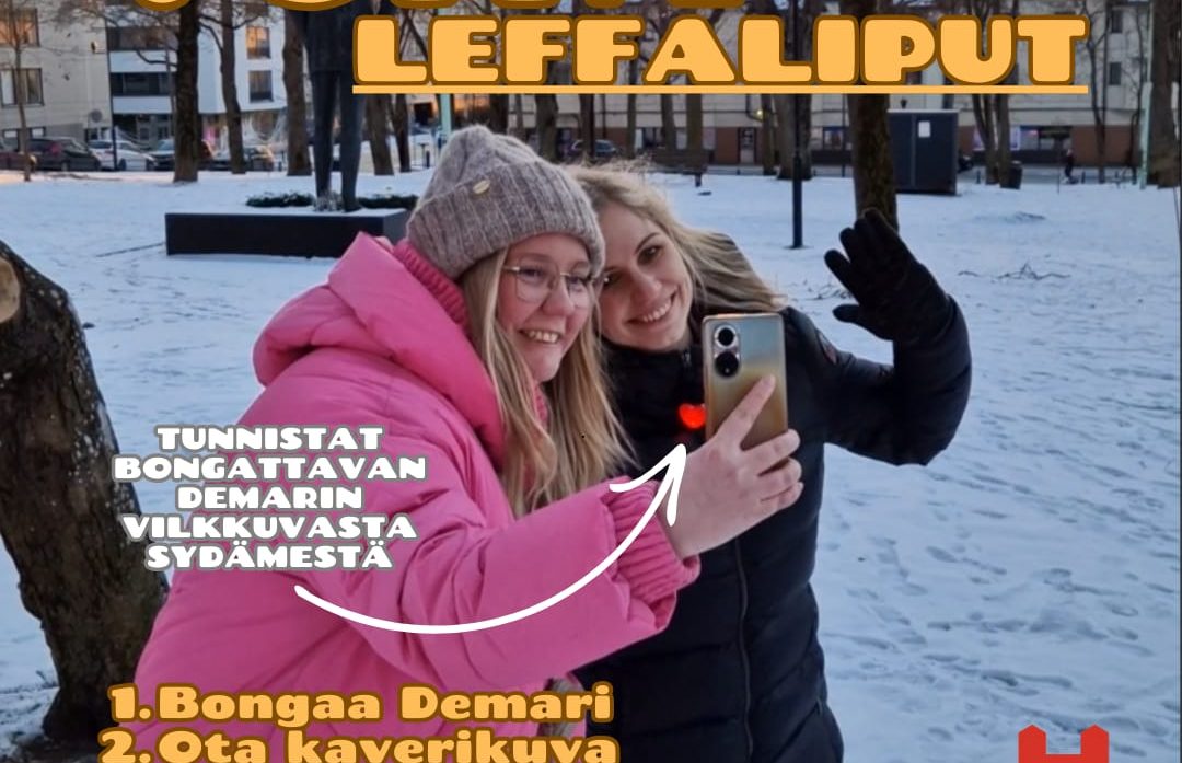 Bongaa Demari ja voita leffaliput itsellesi ja kaverille! Jaossa 3 x 2 kpl elokuvalippuja. Voit osallistua bongaamalla Demarin tai demariopiskelijan Hämeenlinnassa HPK-approjen jälkeen jäähallin ja keskustan välillä perjantaina 21.2.2025 noin klo 21-23. 1. Bongaa Demari, jolla on vilkkuva sydän 2. Ota kaverikuva Demarin kanssa 3. Julkaise kuva Instagramissa käyttäen aihetunnistetta #BongaaDemari ja tägää @hameenlinnan_tyovaenyhdistys (HTY) Kaikki osallistujat saavat heti lakupatukan ja Demariopiskelijoilla on jaossa haalarimerkkejä! Leffalippujen voittajat arvotaan julkaistujen kuvien kesken lauantaina ja voittajille ilmoitetaan henkilökohtaisesti DM