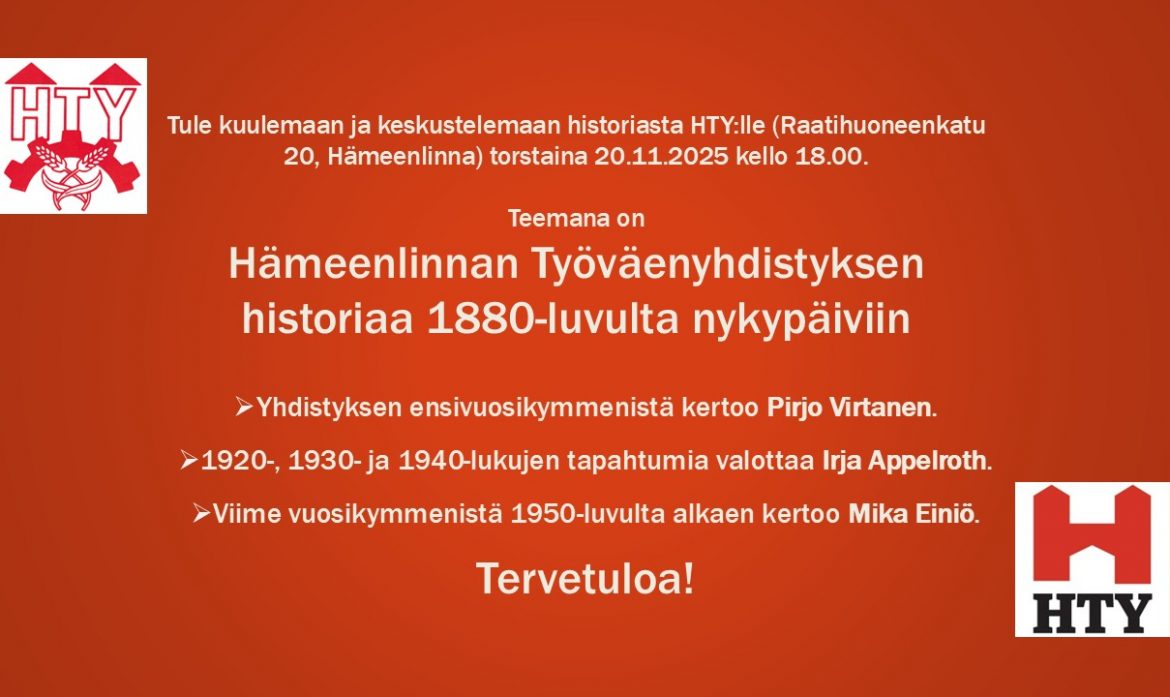 HTY:n historiaa 20.11.2025 Pirjo Virtanen Osana HTY:n järjestämää historian luentosarjaa kuullaan oman yhdistyksemme, Hämeenlinnan Työväenyhdistyksen historiasta. Share Lue lisää . . .