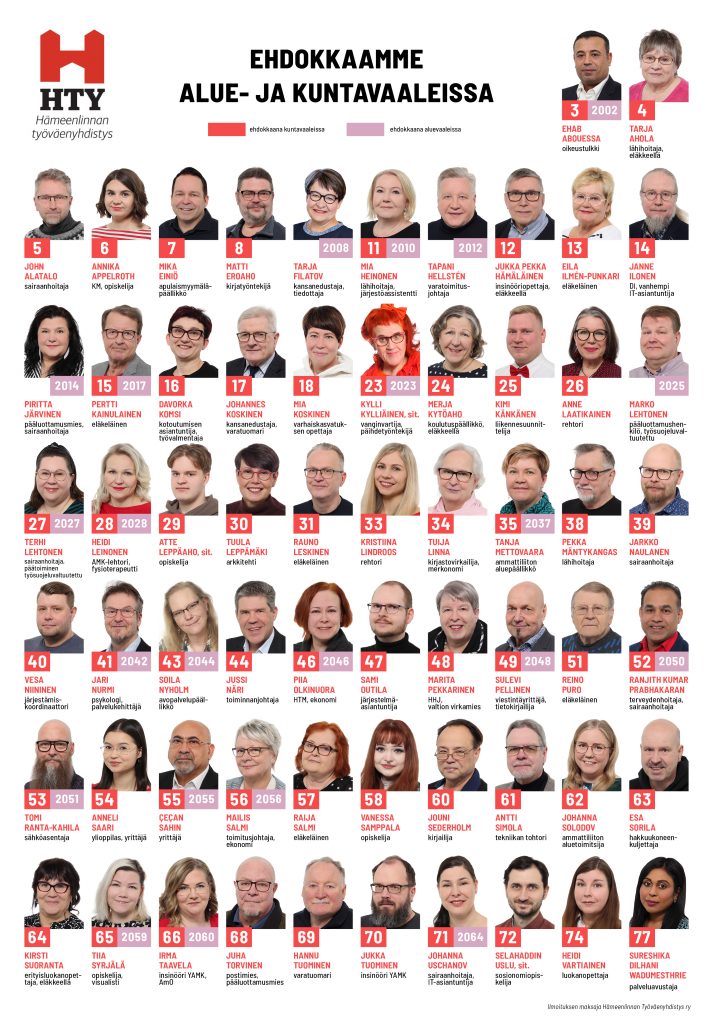 OmaHämeen aluevaltuustoon (Kanta-Hämeen hyvinvointialue) SDP sai 19 paikkaa, jossa lisäystä edellisiin aluevaaleihin oli 4 paikkaa. Valituista 6 on HTY:n jäseniä: Tarja Filatov, Prabhakaran Ranjith Kumar, Mia Heinonen, Tapani Hellstén, Piia Olkinuora ja Piritta Järvinen. Lisäksi valtuustoon valittiin sitoutumattomana Kylli Kylliäinen. Aluevaltuustossa SDP:n ensimmäinen varavaltuutettu on Ehab Abouessa ja toinen ja Terhi Lehtonen. Sydämelliset onnittelut!